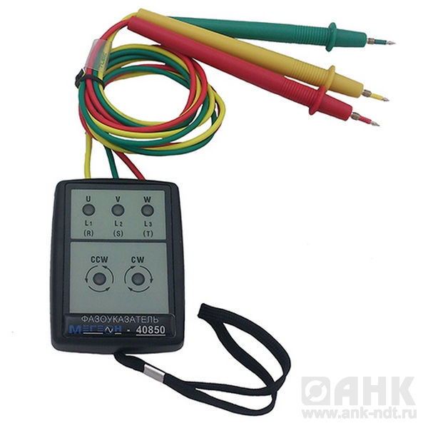 Порядок чередования фаз или полное отсутствие фазы отображается с помощью светодиодов на фронтальной панели прибора и встроенного зуммера. Комплект поставки включает в себя измерительные щупы типа "крокодил", которые существенное упрощают работу с фазоуказателем Мегеон 40850.
