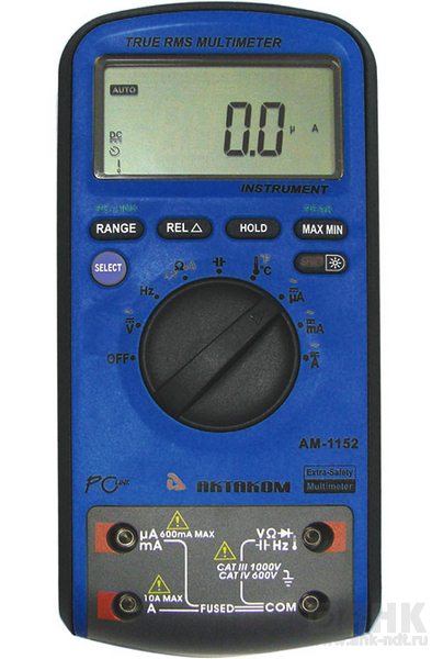 Мультиметр Актаком AM-1152 повышенной безопасности предназначен для измерений постоянного и переменного тока и напряжения, сопротивления, емкости, частоты, температуры, коэффициента заполнения, проверки диодов и прозвонки электрических цепей.