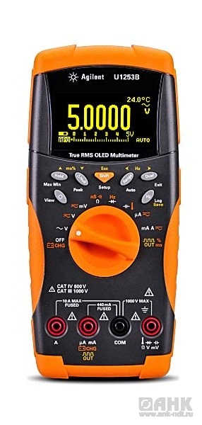 Первый цифровой мультиметр с дисплеем на органических светодиодах (OLED) с углом обзора около 160 градусов. Мультиметр цифровой Agilent Technologies U1253B, являясь полнофункциональным цифровым мультиметром, снабжен также тремя дополнительными функциями, которые необходимы для современной сложной сферы технического обслуживания функциями частотомера, генератора прямоугольных импульсов и термометра. Экономя средства и более эффективно используя рабочее место, пользователь получает при этом все преимущества богатого набора функциональных возможностей и свойств. Прибор обеспечивает также возможность регистрации данных как в ручном, так и автоматическом режиме с использованием интерфейсного кабеля для связи с ПК. Поставляемая с мультиметром программа Agilent GUI Data Logger позволяет пользователю настроить функции регистрации данных под свои потребности и легко обнаружить аномалии при использовании табличного или графического формата отображения.