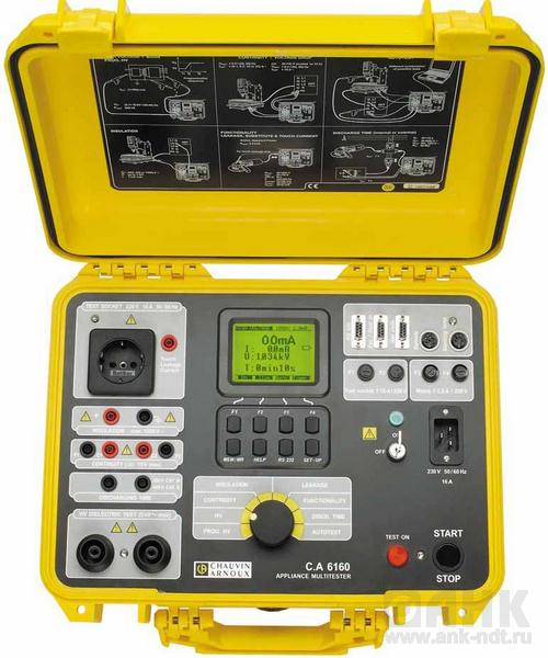 CA6160 является переносной многофункциональной высоковольтной установкой для проведения ряда испытаний различного оборудования, портативных электроприборов, распределительных электрощитов и т.д. Прибор CA6160 может быть подключен к ПК для программирования процедуры измерения и задания последовательности измерений для проведения автоматического испытания. Прибор встроен в удобный для переноски корпус, выполненный в виде чемодана.