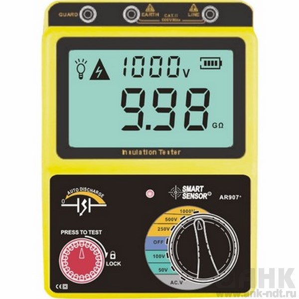 Тестер изоляции AR907+ может измерять сопротивление изоляции в диапазоне от 0 Ом до 20 ГОм. Тестер сопротивления изоляции позволяет производить измерение напряжением от 50В до 1000В, которое разбито на 5 фиксированных режимов. Помимо сопротивления, электрический тестер позволяет измерять напряжение электрической цепи.Тестер изоляции AR907+ при измерении выводит показания на ЖК-дисплей, оснащенный подсветкой.