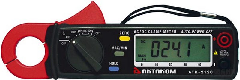 - Токовые клещи. Измерение пост. и перем. тока до 1200 А, диаметр обхвата 23 мм, аналоговый выход 1 мВ/1 А, возможность интеграции прибора с мультиметром/осциллографом, фиксация мин/макс показаний и удержание показаний,