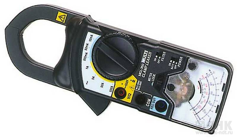 Клещи электроизмерительные со стрелочным индикатором, измерение переменного тока и тока утечки, пределы измерений 10/ 50/ 500 мА/ 1/ 5/ 50/ 500 А (50/60 Гц) с разрешением 1/ 10 мкА/ 100 мА, базовая погрешность 3 %, напряжение 0…500 В, сопротивление 0…1 кОм, раскрытие 40 мм, 2 изм./сек, аналоговый выход для контроля измерений (100 мВ – полная шкала), 2 х 1,5 В тип «ААА», 65 х 210 х 34 мм, 400 г.