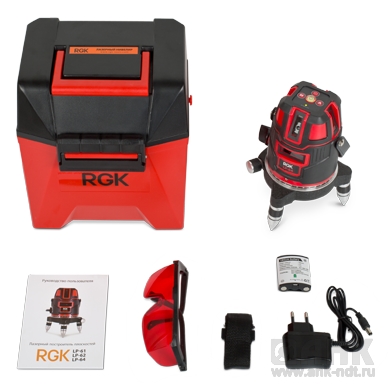 Комплект поставки: лазерный уровень RGK LP-64, кейс, ремень, аккумуляторные батареи, зу для аккумуляторных батарей, очки, инструкция