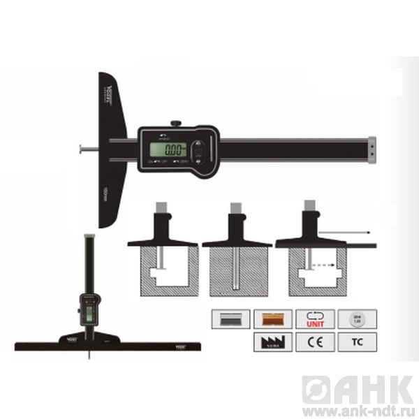 Штангенглубиномеры Vogel цифровые с круглой штангой и со сменными колками, диапазон измерения от 200х0,01 мм до 800х0,01 мм, предназначены для измерения высот и глубин различных деталей. Они построены по принципу штангенциркуля, однако штанга не имеет губок. В зависимости от конфигурации деталей, внутренние размеры которых нужно измерить, используют различные виды наконечников и колков: прямые, крючкообразные и т.д.