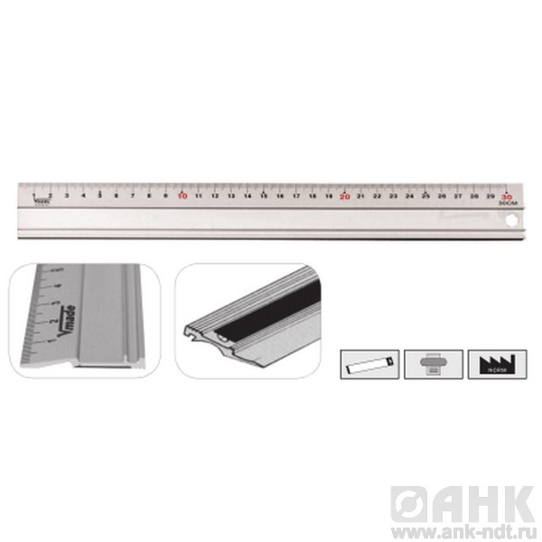 Линейки из твердого алюминия для школ и ручных работ 300, 600 и 1000 мм, на обратной стороне приклеена антискользящая подкладка, предназначены для измерения различных величин, для вычислений и построения чертежей. Определение линейной величины производится путем сравнения нанесенной на измерительный инструмент шкалы и измеряемого объекта. Линейки обычно изготавливаются из дерева, металла, пластика.