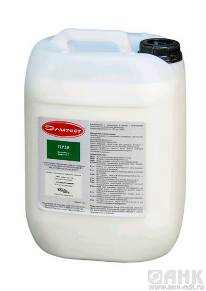 Проявитель белого цвета Элитест ПР20 (быстросохнущий) изготовлен на основе ацетона и предназначен для выявления индикаторных рисунков. Равномерно покрывает поверхность тонким слоем. Быстро высыхает, вытягивая пенетрант из полостей капилляров, образуя чёткое изображение дефектограммы на поверхности, что позволяет уверенно выявлять окрашенные индикаторные следы несплошностей. Обеспечивает высокую чувствительность контроля за счёт растворяющего воздействия на пенетрант в местах расположения дефектов.