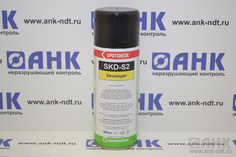 Белый суспензионный проявитель Spotcheсk SKD-S2 представляет собой белый сорбент, диспергированный в быстросохнущих растворителях и поглощающий индикаторный пенетрант. Проявитель SKD-S2 имеет слабый спиртовой запах, коррозионно не активен. SKD-S2 образует матовое белое покрытие, которое обеспечивает отличный контрастный фон для индикаторных рисунков пенетрантов MAGNAFLUX серий SрotcheckTM и ZygloTM. Обеспечивает повышенную чувствительность за счет растворяющего воздействия на пенетрант в месте расположения дефекта.
