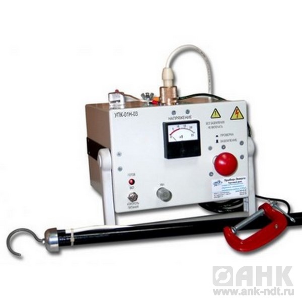 Принцип работы приборов УПК-01Н-03 следующий. Напряжение (нестабилизированное, не менее 17 кВ на холостом ходу) подается на испытываемую нагрузку и измеряется встроенным киловольтметром. У приборов падающая вольт-амперная характеристика, поэтому чем больше утечки, тем меньше напряжение на выходе прибора ( при коротком замыкании оно равно 0). Это и фиксирует киловольтметр.