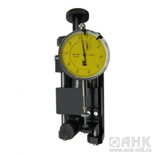 Устройство СМ-1У состоит из основания, на котором установлены опоры. С помощью опор крепятся направляющие, по которым могут передвигаться каретка с упором и каретка с индикатором 6. Каретки соединены тарированной пружиной и могут передвигаться по направляющим при вращении маховика. На каретке с упором установлен корпус, в который с помощью винта, в зависимости от вида покрытия, устанавливаются соответствующие насадки (для битумных изоляционных покрытий или для полимерных изоляционных лент). Для крепления устройства на поверхности изолированного трубопровода, на основании укреплены четыре ножки.