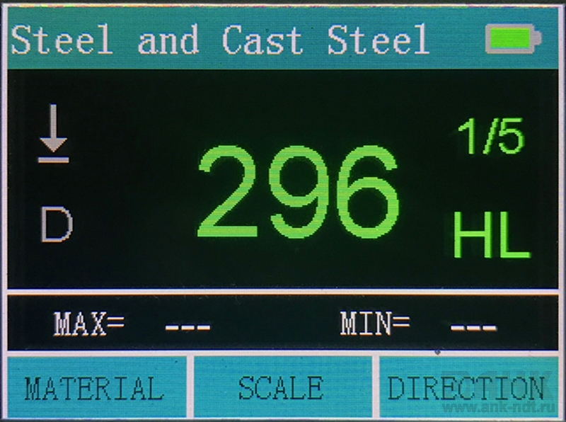 - Лёгкое переключение по различным шкалам твёрдости (HL, HB, HRB, HRC, HRA, HV, HS)