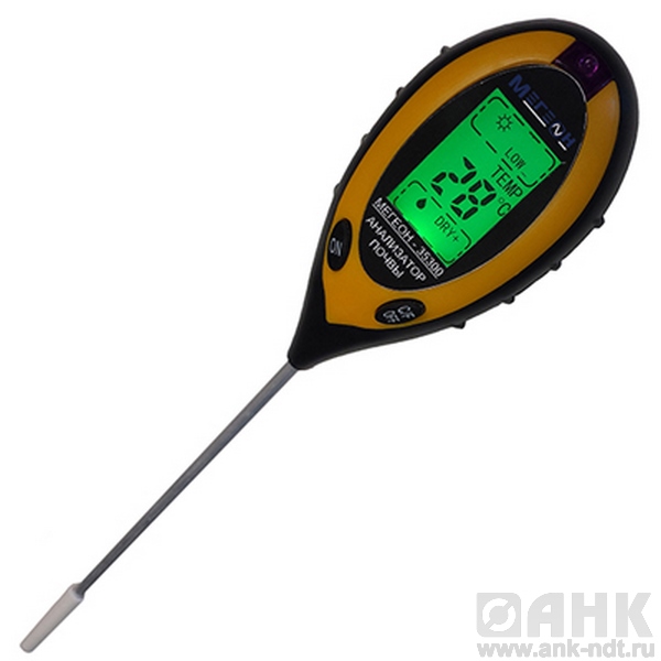 Полученные результаты измерений выводятся на ЖК-дисплей прибора. Достаточно погрузить измерительный зонд в исследуемый грунт вблизи растения. Кроме уровня кислотности почвы, данный измеритель измеряет температуру и влажность почвы, а встроенный датчик освещенности постоянно информирует пользователя об уровне интенсивности солнечного света. Большой ЖК-дисплей со встроенной подсветкой позволяет пользоваться прибором даже в условиях плохой освещенности. Отличительные особенности: