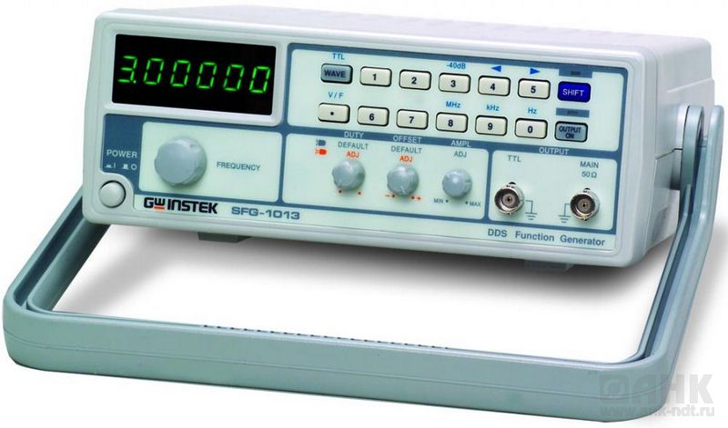 - Диапазон частот 0,1 Гц — 3 МГц (синус), 0,1-1 МГц (треугольник), 0,1-100 кГц (меандр), ТТЛ, прямой цифровой синтез, погрешность установки частоты ±(20*10-6),