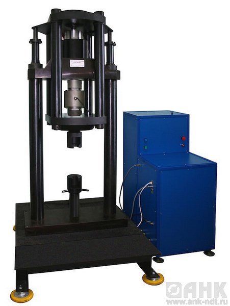 Машина состоит из силовой рамы с нагружающим цилиндром, реверсором и шкафа управления, снабжена гидравлическим устройством подъема и опускания реверсора. Машина не нуждается в фундаменте и монтируется на виброопорах.