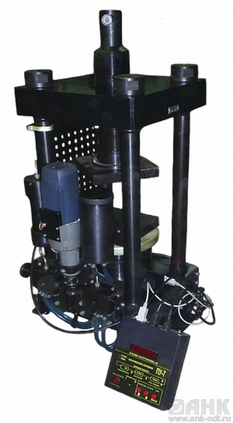 Машина состоит из силовой рамы с нагружающим цилиндром, реверсором и шкафа управления, снабжена гидравлическим устройством подъема и опускания реверсора. Машина не нуждается в фундаменте и монтируется на виброопорах.