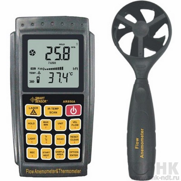 Цифровой анемометр AR856A помимо измерения скорости ветра имеет множество других функций. Прибор позволяет производить вычисления с полученными данными, измерять температуру и относительную воздушную температуру. Для целей измерения температуры прибор имеет встроенный инфракрасный термометр. Кроме всего прочего, данная модель позволяет измерять объем потока воздуха. Электронный анемометр - это своего рода портативный компьютер, позволяющий производить многофункциональные интеллектуализированные измерения. Анемометр AR856A может использоваться во многих сферах деятельность, связанных с прохождением потока воздуха, таких как сфера отопления, вентиляция, кондиционирование воздуха. Обширное применение устройстваимеет место в защите окружающей среды, контроле энергосбережения, метеорологии, сельском хозяйстве, охране труда, химическом и тканном производстве, лабораториях. Прибор оснащен USB интерфейсом для взаимодействия с компьютером.