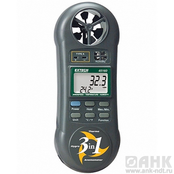 Гигротермоанемометр Extech 45160 - 3 прибора в 1: измеритель влажности, температуры и скорости движения воздуха. Встроенный прецизионный тонкопленочный емкостный датчик влажности с быстрым временем отклика. Измерение высоких температур при помощи термопары типа К. Встроенный термистор для измерения температуры окружающего воздуха.