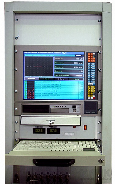 Информация от измерительной части поступает в реальном времени на управляющую ЭВМ и выводится на экран в виде ленты электронного самописца. Управляющая ЭВМ расположена в стойке регистрации. Программное обеспечение, работающее под управлением операционной системы Windows XP, выполняет задачи отображения и регистрации результатов контроля измерительной части установки, ведёт электронный журнал работы установки, а так же сохраняет на жесткий диск результаты УЗ контроля в виде протоколов для дальнейшего просмотра и вывода на печать.