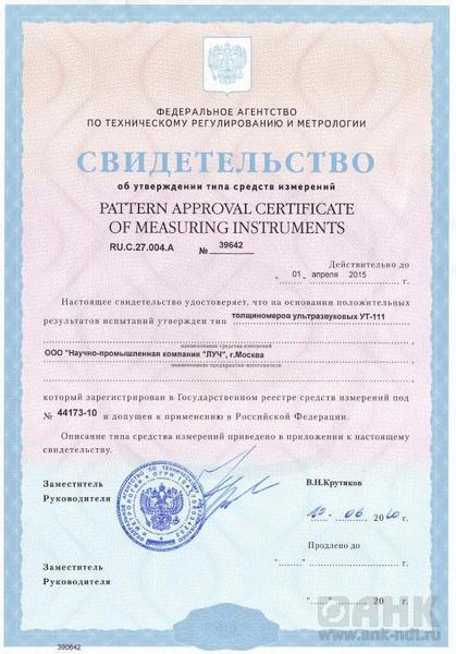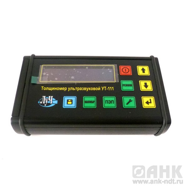 Толщиномер ультразвуковой УТ-111 общего назначения по ГОСТ 28702-90, предназначен для ручного контактного измерения толщины изделий из различных металлов и сплавов, стекла, керамики, полимерных и композиционных материалов, у которых коэффициент затухания ультразвуковых колебаний на частоте 5,0 МГц не превышает 0,3 дБ/см, со скоростями распространения продольных ультразвуковых колебаний (УЗК) от 100 до 9999 м/с при одностороннем доступе к объекту измерения. Толщиномер предназначен для измерения толщины изделий с плоской и выпуклой цилиндрической поверхностями со стороны контакта с УЗ ПЭП. Толщиномер предназначен для эксплуатации в лабораторных и цеховых условиях, на предприятиях черной и цветной металлургии, в машиностроении, химической, нефтедобывающей и нефтеперерабатывающей промышленности и т.п. для контроля остаточной толщины изделий и металлоконструкций, подвергающихся коррозионному, в том числе и атмосферному воздействию. Толщиномер (при использовании соответствующих типов УЗ ПЭП) может контролировать остаточную толщину изделий и металлоконструкций, находящихся под водой: обшивки корпусов судов и плавучих технических средств, стальные листовые и панельные элементы гидротехнических сооружений, трубопроводы, дюкерные переходы и т.п.