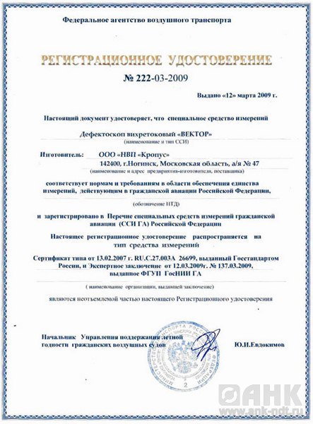 Вихретоковый дефектоскоп ВЕКТОР сертифицирован Федеральным Агенством по Техническому Регулированию и Контролю и зарегистрирован в Государственном реестре средств измерений под №33845-12.